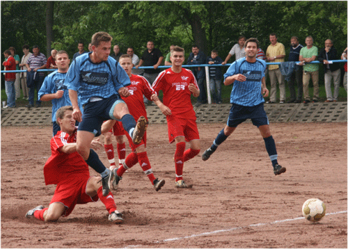 Wild entschlossener Blick: Jakob Fischer bekam nach seiner Auswechslung viel Beifall für diese tolle Partie. Beruhigend, dachte die Blau-Weiße-Fangemeinde. Ein zufriedener Trainer hatte das Team gelobt und orakelt, dass man nun noch mehr Räume bekäme. Und es sah auch so aus, als ob Niederpöllnitz nun gerade seinen Torhunger entdeckt hätte: Stoyas Großchance lenkt Köhler zur Ecke, der darauf folgende Kopfball Zöllners geht drüber (52.). Und beim Kopfball Fischers (53.) kann sich Anisch nicht bremsen und brüllt: „Gut so, Leute, sieht geil aus!“ Sah es auch, denn Niederpöllnitz drängte vehement auf das nun alles entscheidende 4. Tor. Das fiel aber trotz guter Gelegenheiten nicht und so kamen die Schmöllner immer besser ins Spiel, hatten durch Rettberg ihre bis dato beste Chance, aber der Stürmer vergibt kläglich aus 3 Metern (64.). Niederpöllnitz sah dem „Kopfheben“ der Gäste interessiert zu und stellte mehr oder weniger das Fußballspielen ein. Das Zusammenspiel Böttgers mit Tashev im Mittelfeld klappte nicht mehr und so fehlte den Blau-Weißen der Zug nach vorn. Und so kamen die Schmöllner immer besser in eine Partie, die sie schon verloren glaubten. Als nach einem Freistoß von Fischer Tashev, Stoya und Böttger jeweils im Nachschuss scheitern (74.), war die vorerst letzte Chance der Hausherren vertan. Und nach einem Foul Frankes an Rettberg im Strafraum wurde die Luft durch den verwandelten Elfmeter von Kapitän Neumaier (79.) noch dünner. Nun wollte Schmölln den nun durchaus im Bereich des Möglichen liegenden Ausgleich. Aber Niederpöllnitz zeigte sich noch einmal eiskalt. Nachdem Fischer während der Partie vielleicht zehnmal aus dem Abseits gewunken wurde, klappte es in der 86. Minute: Allein auf Köhler zukurvend, schlenzt der Stürmer das Leder ins entlegene Eck zum nun endgültig entscheidenden 4:2.