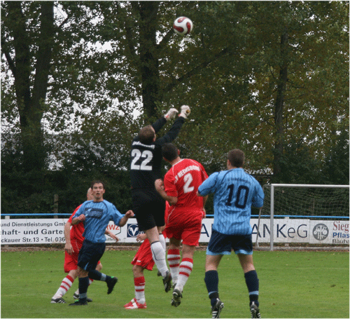 Volle Granate, Renate! Falk Werner schmeißt sich in den Ball. Halbzeit Zwei begann mit einem allgemeinen Einschlafen. Trainer Hohlfeld aus Hermsdorf bezeichnete das unmotivierte Gekicke mit „Angsthasenfußball“. Für Belebung sorgte erst wieder Anisch, der seine neue Heimat bei Standarts im gegnerischen Strafraum gefunden zu haben scheint. Sein Hinterkopf-Kopfball segelt allerdings knapp vorbei (61.). Beide Mannschaften konnten sich in ihren Angriffslinien nicht durchsetzen, so folgten weitere 15 Minuten Grausamkeit. Erst dann tat sich etwas Interessantes: Der Ex-Niederpöllnitzer Dix machte sich bereit und wurde eingewechselt, kam aber bis Ende der Partie kaum noch an den Ball. Die Partie hatte nun nur noch einen Höhepunkt zu bieten: Zöllners klasse freistoß wird durch eine ebenso klasse Reaktion Eglmeyers entschärft. Das war dann kurz vor der Entscheidung des genervten Schiedsrichters, die Partie abzupfeifen. Wie gesagt: „Ein Spiel hat 89 Minuten und der Ball ist eckig.“ Meinungen zum Spiel |