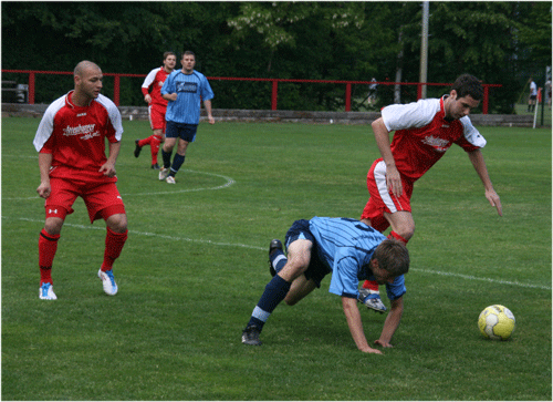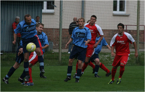Zweimal Killerblick: Vorn wehrt Falk Werner den Ball ab, dahinter lunst Enrico Anisch, ob alles gut geht. Trotzig hatte Blau-Weiß das 0:0 verdient. Der ZFC kam dementsprechend auch sehr schnell wieder aus der Kabine und man durfte nun wohl ein Feuerwerk erwarten. Aber es ging bei den Roten wieder pomadig los. Die fanden einfach kein Mittel, die nach wie vor kämpferisch absolut überzeugenden Niederpöllnitzer auszuhebeln. Im Gegenteil: Die Gäste waren absolut gleichwertig, hatten in Werner einen fehlerfrei spielenden Libero und setzten die Marschroute Behlings überzeugend um. Nur bei Ph. Rieses Granate nach 77. Minuten musste Weißgärber sein ganzes Können aufbieten, ansonsten herrschte Harmlosigkeit im Erarbeiten von Chancen vor. Zwar brachten ein paar flache Eingaben kurzzeitig die Gemüter in Wallung, aber ansonsten waren die recht zahlreichen Zuschauer wohl schon mit dem 0:0 gedanklich verschwunden. Dann kam die Kopfballabwehr von Anisch auf den Fuß von Ph. Riese und der ist technisch in der Lage, den Ball flach zum 1:0 einzuhämmern. Wenn also die alte Regel zutreffen sollte, die besagt, wenn man unten steht, kommt zum Unglück auch noch Pech dazu – dann wohl in diesem Spiel. Aber Niederpöllnitz kann hoffen. Bei solchen Leistungen sollte es doch mit dem Teufel zugehen, wenn sich in den letzten drei Spielen nicht noch Punkte ansammeln würden.